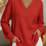 Hold dig varm, selv når temperaturerne falder til 5 grader, med vores luksuriøse damesweater – fremstillet af tung, dobbeltlaget vaffelstof, der giver en utrolig blød og varm følelse. Indersiden er særligt hyggelig og føles som fleece mod huden, så du kan nyde maksimal komfort på kolde dage.