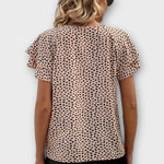 • Allover-mønster og detaljer: Livligt mønster kombineret med flæser ved krave og ærmer for en sofistikeret stemning.