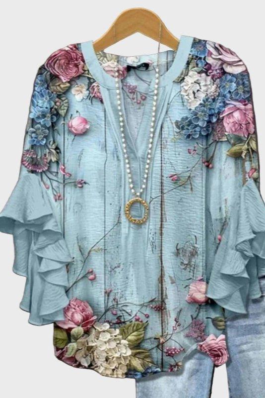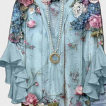 Mette | Lyseblå Bluse signalerer friskhed og femininitet hos den moderne kvinde, der værdsætter tidløs elegance. Den lyseblå base fremhæver et blomsterprint i nuancer af lyserød, lilla og hvid og danner et raffineret canvas. Med håndværk i små serier og materialer af høj kvalitet udført med omtanke, er blusen skabt til lang levetid og kontinuerlig relevans.