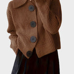 Hana | Cardigan udstråler luksus gennem håndværk og tidløs detaljer. Den dybe kakaobrun nuance, markante knapper og en robust krave giver et sofistikeret, jordnært udtryk til efterårs- og vintersæson. Den tykke ribstrik er varm og behagelig mod huden, hvilket gør Hana til en naturlig følgesvend til cafépausen, en gåtur eller en stille stund med en god bog. Som et symbol på værdi og samlerappel føles Hana samtidig som en investeringsgenstand, der står elegant sæson efter sæson.