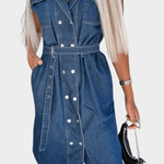• Silhuet og pasform: Ærmeløs silhuet med talje fremhævet af et matchende bælte i samme stof.