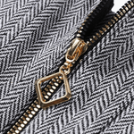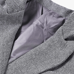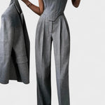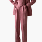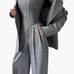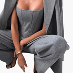 - Tre-delt design: Skræddersyet blazer, formet korset og højtaljebukser danner en kontrolleret silhuet, der subtilt fremhæver linjerne.