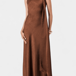 Robina | Kjole forener sofistikeret enkelhed med en luksuriøs finish og skaber et fuldendt look til særlige begivenheder. Dette design vidner om håndværksmæssig omhu og materialer af højeste kvalitet, båret gennem århundreders tradition og nøje udvalgte værksteder. Den elegante, flydende silhuet følger bevægelserne, mens den asymmetriske halsudskæring tilføjer et moderne præg. Den bronsefarvede stof fremstår dybt og kontrolleret, og giver en diskret luksus, der nemt matches med højhærede sko og gyldne accessories. Robina er en investering i tidløs elegance og samlerappel, der står tidens trend.