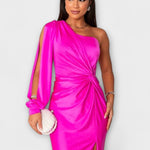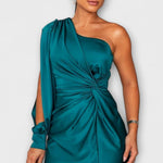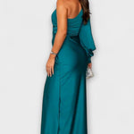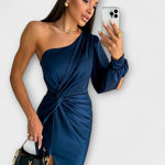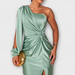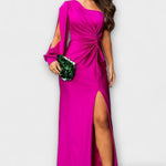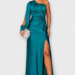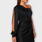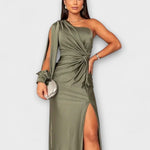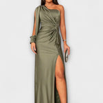 - Siluet og komfort: Én skulder, sculptural linjeføring og sidesplit giver bevægelsesfrihed uden kompromis.