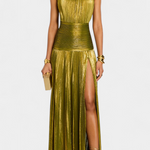 Emma | Metalkjolen udstråler skulpturel glamour og en magnetisk energi, der hæver enhver begivenhed til en invitation til eksklusivitet. Den peridotgrønne, metalliske overflade fanger lyset fra alle vinkler og giver kjolen en tidløs glans uden at virke prætentiøs. Halterneck-designet fremhæver nakken og skaber en elegant, slank silhuet, mens den åbne ryg tilfører kontrast og raffineret sensualitet. Den høje forsidesplit bevæger sig med kroppen og giver en dynamisk linjeføring gennem aftenen. Med begrænset produktion og håndværksmæssig omtanke repræsenterer Emma en investering i provenance og samleobjektværdi samt langtidsholdbar elegance.