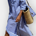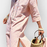 Luna | Stribet skjortekjole forener klassisk elegance med nutidig lethed. Hver detalje afspejler håndværkets omtanke og en arv af tidløst design, mens det stribede mønster i en neutral palet giver et eksklusivt look, der kan bæres år efter år. Stoffet er blødt og åndbart, så du forbliver komfortabel gennem dagen, og den afslappede silhuet flatterer alle kropstyper. Med Luna får du en investering i tidsløs stil og eksklusivitet samt en ejeroplevelse, der føles både fin og funktionel. Produktion i et begrænset antal understreger den velansete samlerappel.