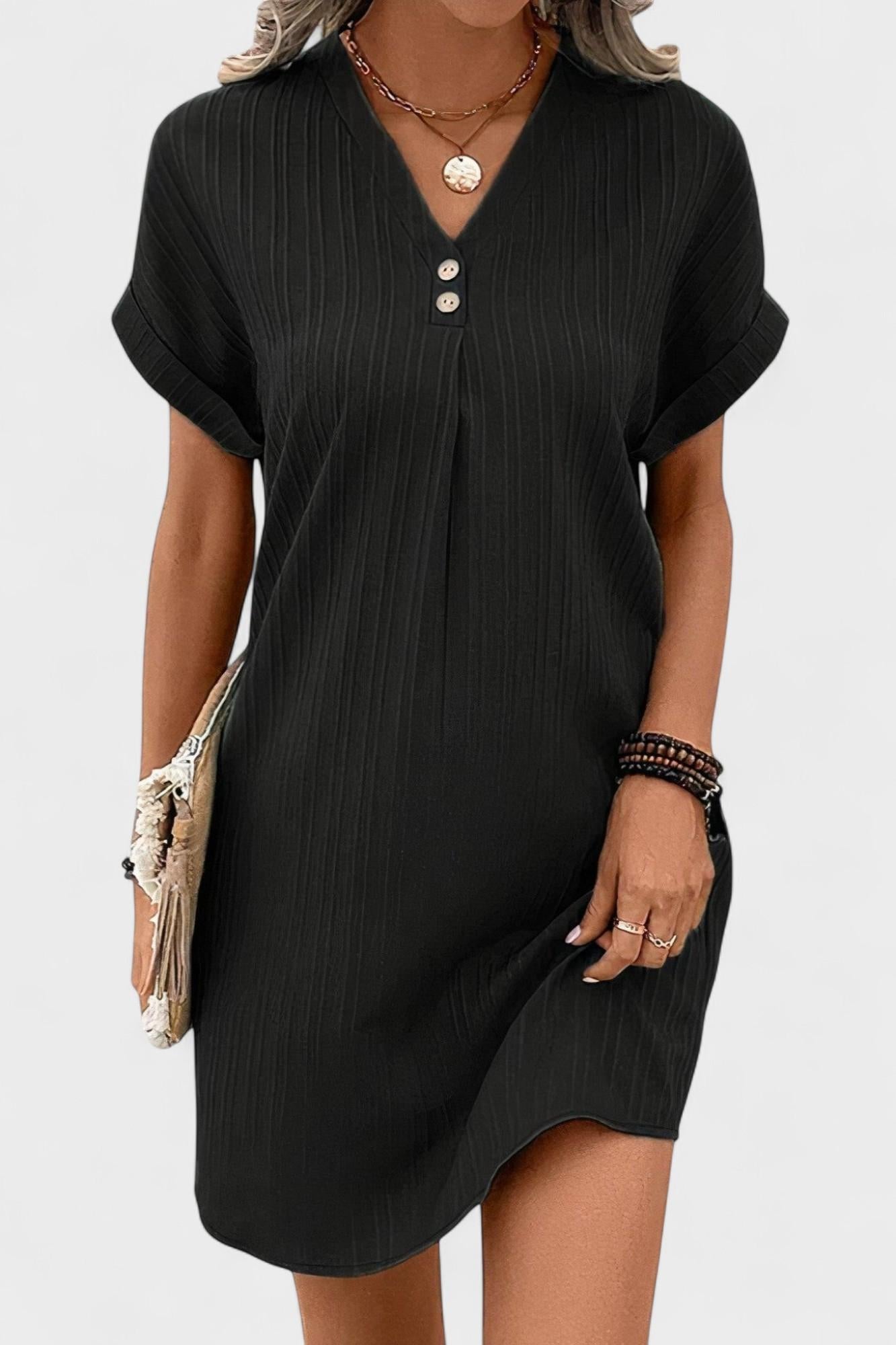 • Feminin V-hals og silhuet, der fremhæver dekoléten med elegant lethed.