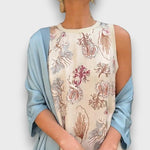 - Dæmpet blomsterprint og diskret halsudskæring forfinet raffinement til sommerlige terrasser, gåture ved vandet og elegante sammenstillinger med sandaler.
