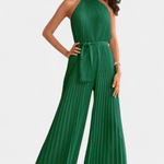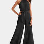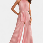 - Silhuet og bevægelse: Plisseret stof, Palazzo-snit og halterneck skaber bevægelse og visuel forlængelse.