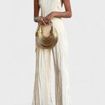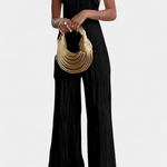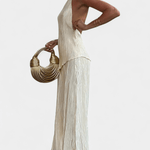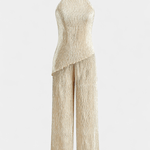 Freja | Minimalistisk sæt repræsenterer et møde mellem tidsløs elegance og håndværk i ypperste kvalitet. Den asymmetriske halterneck-top med åben ryg og høj krave fremhæver en slank silhuet, mens de lange, brede bukser bevæger sig med dig og afslører en sofistikeret drapering. Stoffet er plisseret med en diskret glans og en blød fornemmelse, der følger kroppens kurver. Freja hviler på en arv af klassisk kvalitet og omhyggelig detaljeudførelse, hvilket gør sættet til en investering i garderoben. Sortimentet er begrænset, hvilket giver eksklusivitet og tidløs samlerværdi.