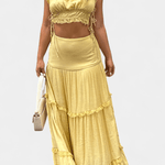 • Let maxi-skjørt med bløde fald og delikate lag; volanger svæver smukt ved hvert skridt.