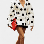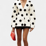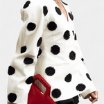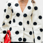 Clara | Jakke udstråler tidløs luksus gennem håndværk og materialer af høj kvalitet. Den rene hvide tekstur med forhøjede prikker tilfører dybde og en diskret glans, mens V-halsen giver et moderne præg. Slim fit-snittet former silhuetten med elegance og bevægelighed. Clara står som et ikon for tidløs værdi og diskret samlerappel i en garderobe, der balancerer behagelig komfort med nordisk præcision.