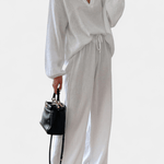 Med Asta | Langærmet sæt møder du tidløs elegance og håndværk i let bomuld. Den flatterende V-hals og den draperede silhuet giver et let, luftigt look, mens det to-delte design skaber et raffineret, afslappet udtryk. Sættet vidner om en arv af kvalitetsdesign og nøje udvalgte materialer, der tilsammen giver en varig tilføjelse til garderoben. Den åndbare bomuld står for komfort hele dagen, og den brede buksekonstruktion med justerbar talje tilføjer fleksibilitet uden at gå på kompromis med stil. Asta henvender sig til den krævende forbruger, der værdsætter detaljer, holdbarhed og en gennemført æstetik.
