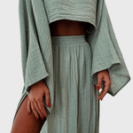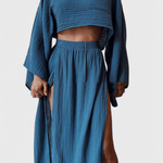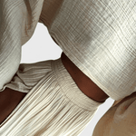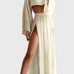 Astrid | Langærmet sæt er et sofistikeret udtryk for luksus gennem omtanke og håndværk. Det lette design binder en luftig top med en højtaljet nederdel og skaber en balance mellem elegance og friskhed, ideel til solrige dage og særlige aftener. Materialerne er lette og åndbare, og konstruktionen er nøje udformet til at holde formen og komforten gennem dagen. Som en investering i tidløs stil og kvalitetsmaterialer vidner Astrid om præcision i snit og en æstetik, der appellerer til kræsne samlere. Med begrænset antal står sætlet som en eksklusiv detalje i garderoben og vidner om en håndværkstradition, der tåler tidens prøvelser. Fuldfør looket med rem- eller håndlavede sandaler for en naturlig, afslappet elegance.