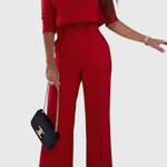 • Silhuet og pasform: 3/4-ærmet top og vide bukser skaber en ren, klassisk silhuet og fri bevægelse.