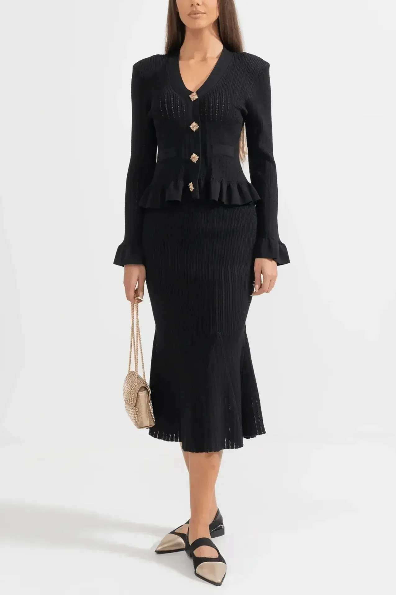 Prudence | Sæt udstråler tidløs elegance og mærkets stolte arv gennem hvert snit. Sættet består af en figursyet V-hals cardigan med sarte ruffles ved ærmerne og vintage-inspirerede knapper sammen med en højtsiddende A-line midi-nederdel, alt sammen i førsteklasses garn og udført med minutiøs syning. Den bløde, åndbare konstruktion giver komfort hele dagen, mens de velovervejede detaljer og den elegante snit sikrer en sofistikeret silhuet, der nemt går fra afslappet til formel. Med begrænset tilgængelighed tilbyder Prudence | Sæt en ægte samlerappel og en tidløs investering i garderoben, der holder år efter år. Højt liv og A-line snit giver en tidløs, flatterende silhuet, der holder år efter år.