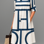Med Amalie | Kjole forærer mærket Julia-kjolen en hyldest til struktureret elegance og tidløs selvtillid. Den marineblå geometriske mønster står i skarp kontrast til en naturhvid bund, og hver søm vidner om håndværkets omhu samt kvalitetsarv, understøttet af en begrænset produktion, der giver kjolen en tydelig eksklusivitet. Den tidløse silhuet forener klassisk skjorte-krave med en let A-linje og skaber en balance mellem komfort og stil til enhver anledning.