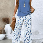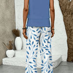 • Indigotone top i elegant kontrast til hvide bladprint bukser fremhæver nordisk æstetik og omtanke for detaljer.