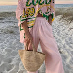 Karen | Tropisk sæt fra Coco Market forener sofistikeret tropisk æstetik med håndværksmæssig omtanke. Den pudderrosa base giver diskret elegance, mens det markante grafiske tryk 'Tenemos Coco!' på den oversized top tilfører et legende, raffineret præg. Dette to-delte sæt kombinerer let og åndbar kvalitet med en afslappet silhuet og en tidløs pasform, der passer til solrige dage ved kysten eller i byen. Med fokus på håndværk og udsøgt materiale står Karen | Tropisk sæt som et varigt element i garderoben, der bærer personlighed og omtanke. Tidløst og samlervenligt design – et sæt der forventes at blive et varigt element i garderoben.