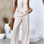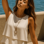 Malou | Strandglød sæt udstråler tidløs kystnær luksus med en luftig silhuet og ubesværet stil. Sættet består af en blød to-lags top med drapering og brede bukser, der falder elegant og flatterer enhver figur. Den creme-neutrale nuance harmonerer med solbrun hud, gyldne smykker og dine yndlingssandaler og skaber et sofistikeret look uden besvær. Gennemarbejdede snit og let konstruktion giver bevægelsesfrihed og rolig selvtillid i enhver anledning. Malou signalerer håndværk og omtanke i hver detalje og afspejler strandlivets krav til kvalitetsfølelse. Med sin alsidighed kan sættet bæres samlet eller separat, hvilket giver tidløse stylingmuligheder til middag ved havet, gåture og brunch — og er let at pakke til ferie og weekendture. Begrænset antal enheder understreger sætets eksklusivitet og gør Malou til en varig investering.