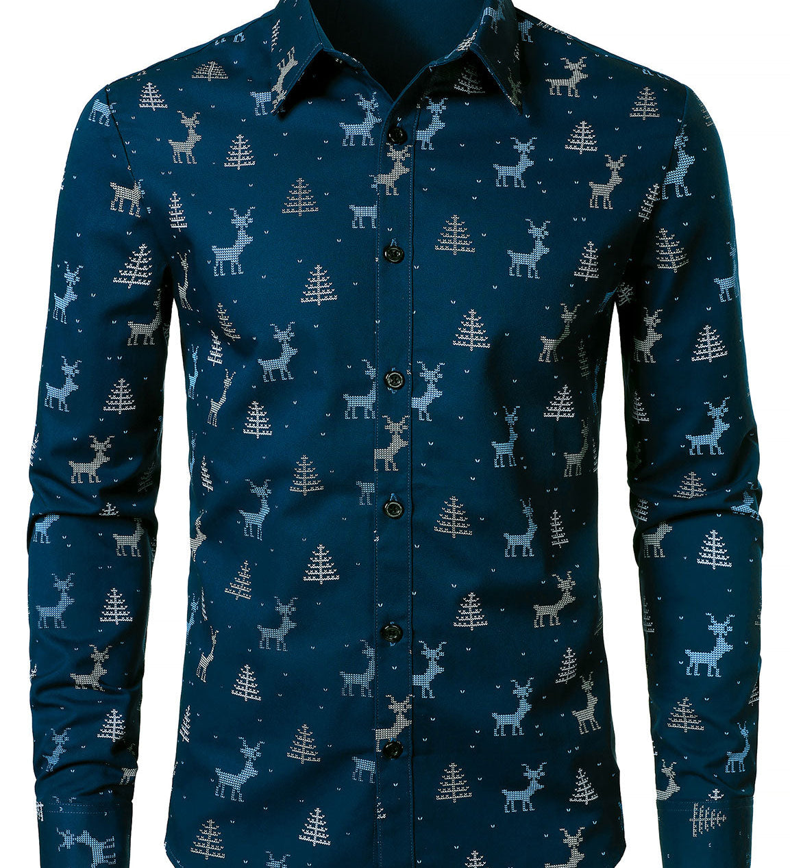 Herre Juletræ Elg Print Åndbar Marineblå Langærmet Skjorte